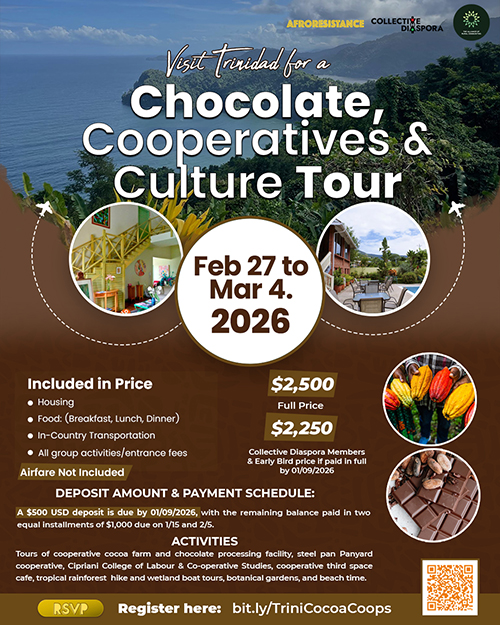 ACTIVITIES INCLUDE: tours of cooperative cocoa farm and chocolate processing facility, steel pan Panyard cooperative, Cipriani College of Labour & Co-operative Studies, cooperative third space cafe, tropical rainforest hike and wetland boat tours, botanical gardens, and beach time.